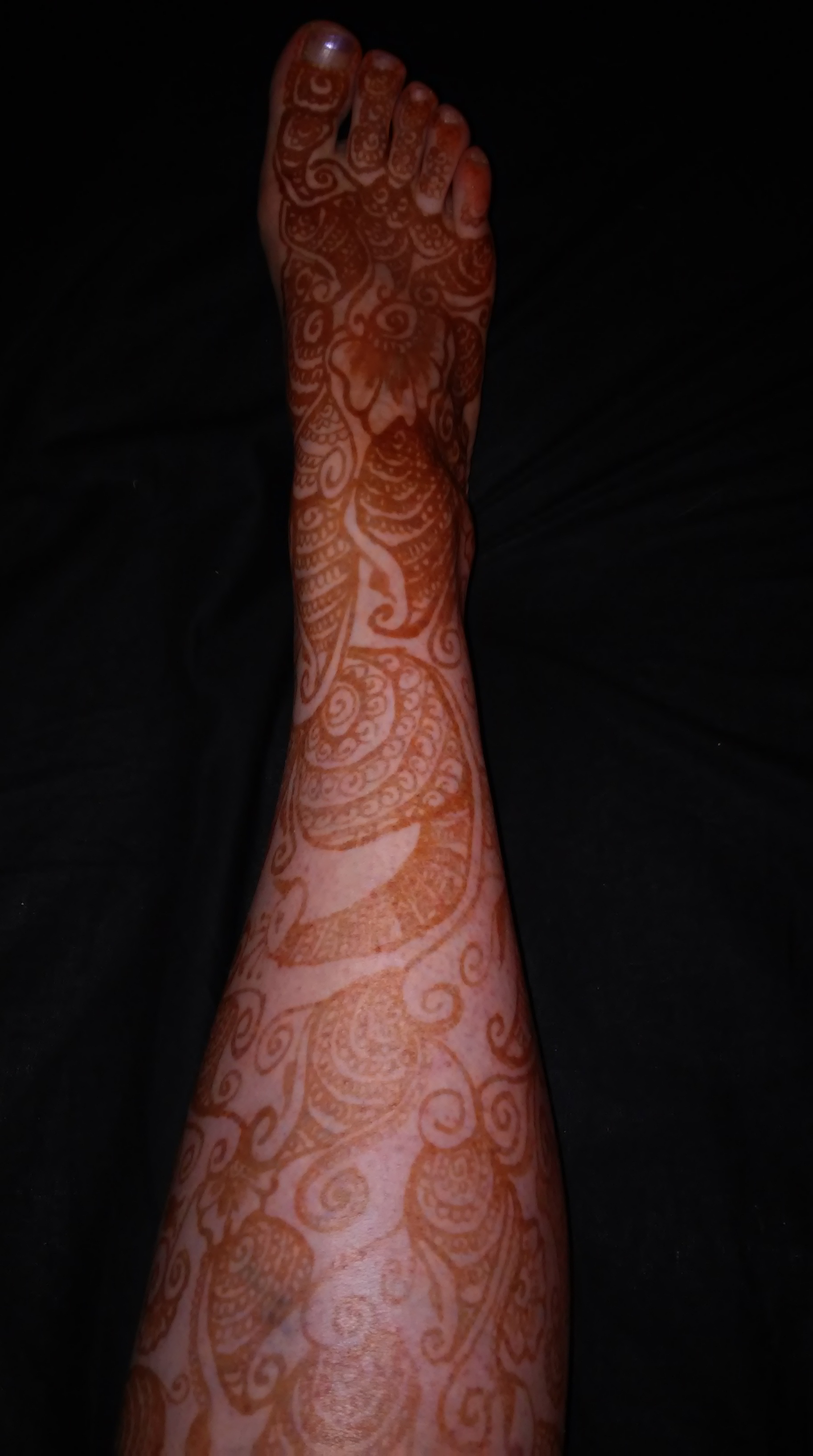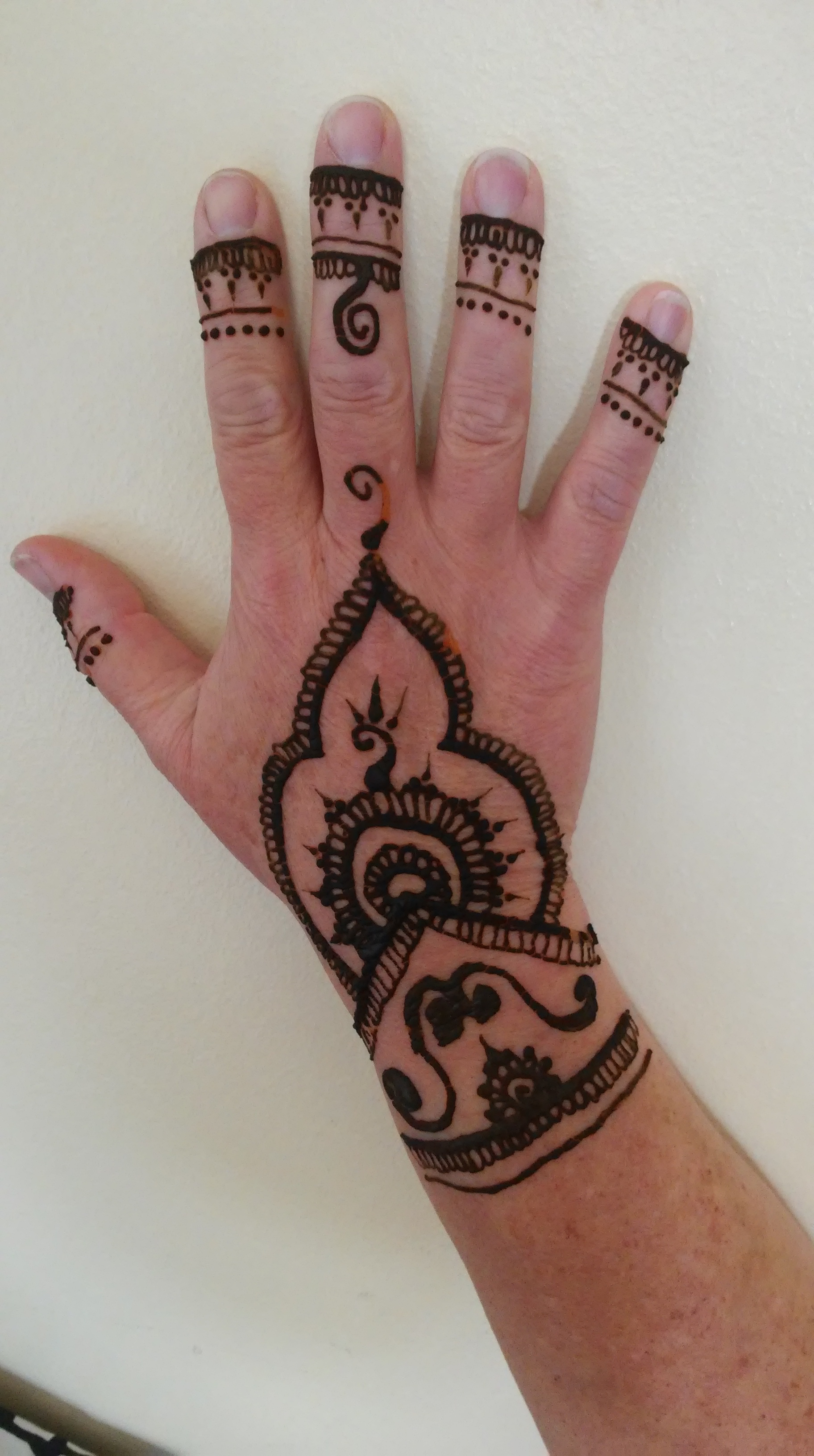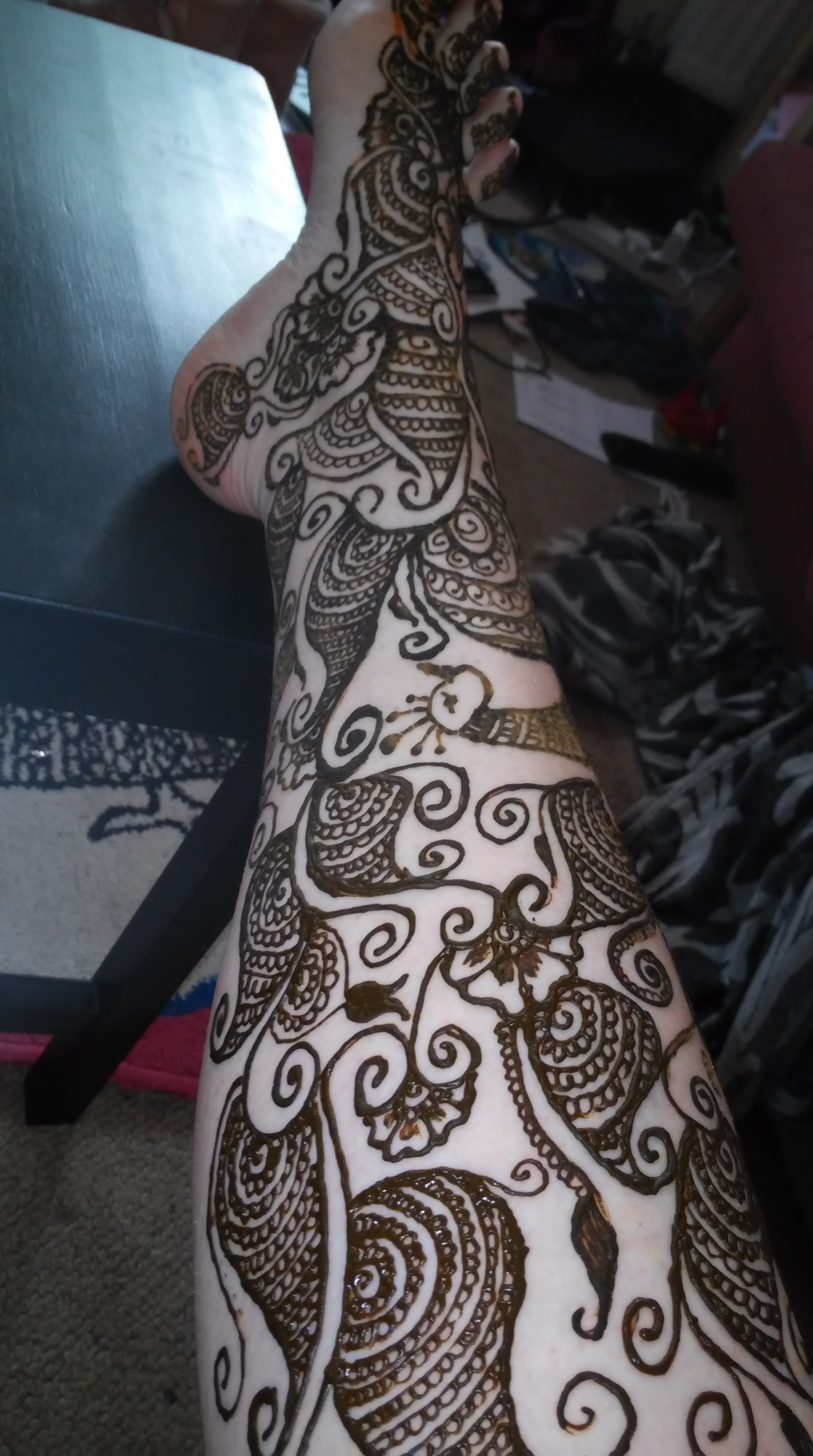 Here are a couple of designs I did a couple of weeks ago on hands.  Also a few weeks back I was experimenting with leaves and birds and decided to decorate my whole leg! Took 3 hours and 2 cones of henna but was great fun!  I’ve also added pictures of the stain developing to show how it darkens.  The stain did darken further on my leg, after about 48 hours it stopped darkening.