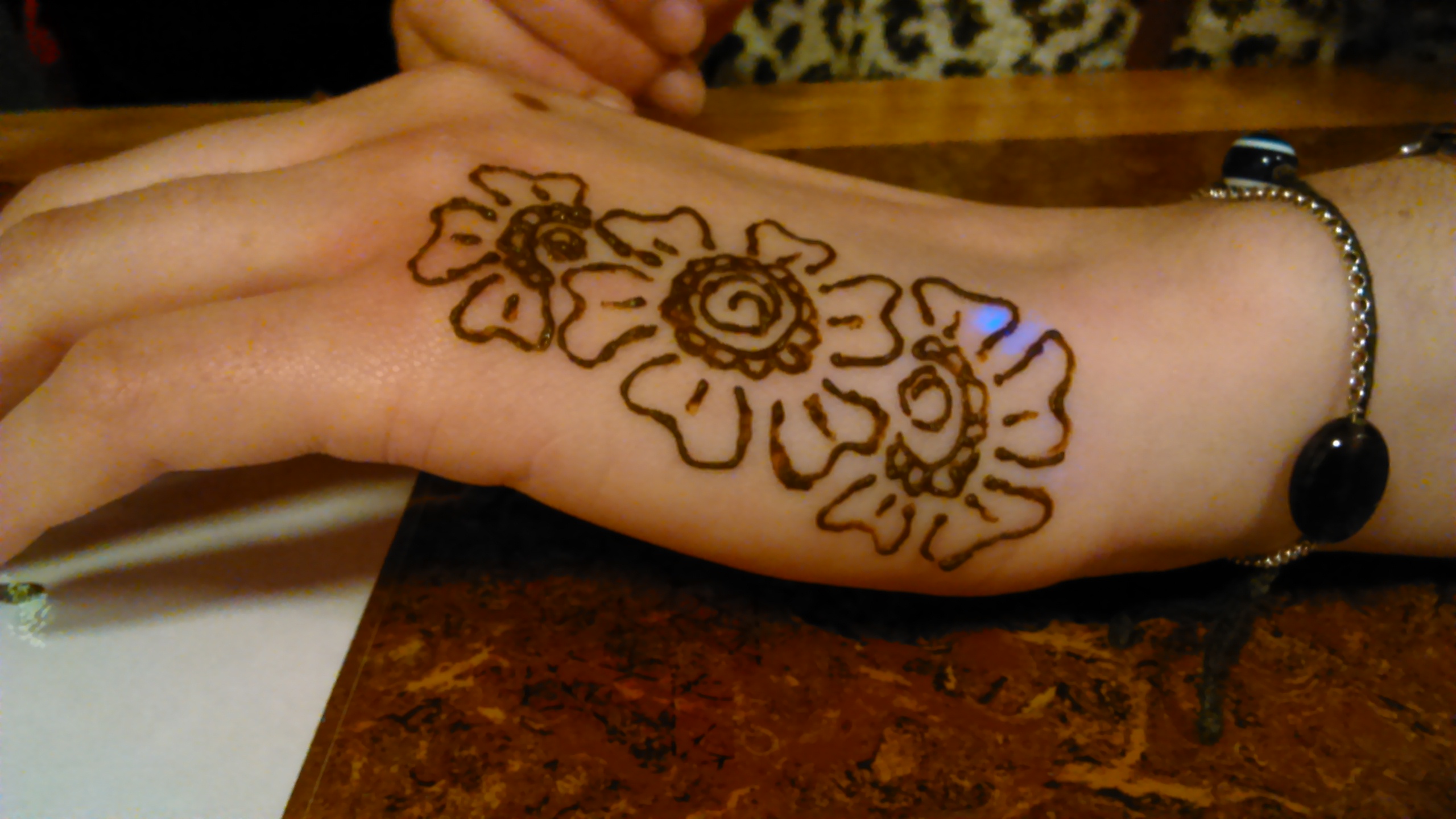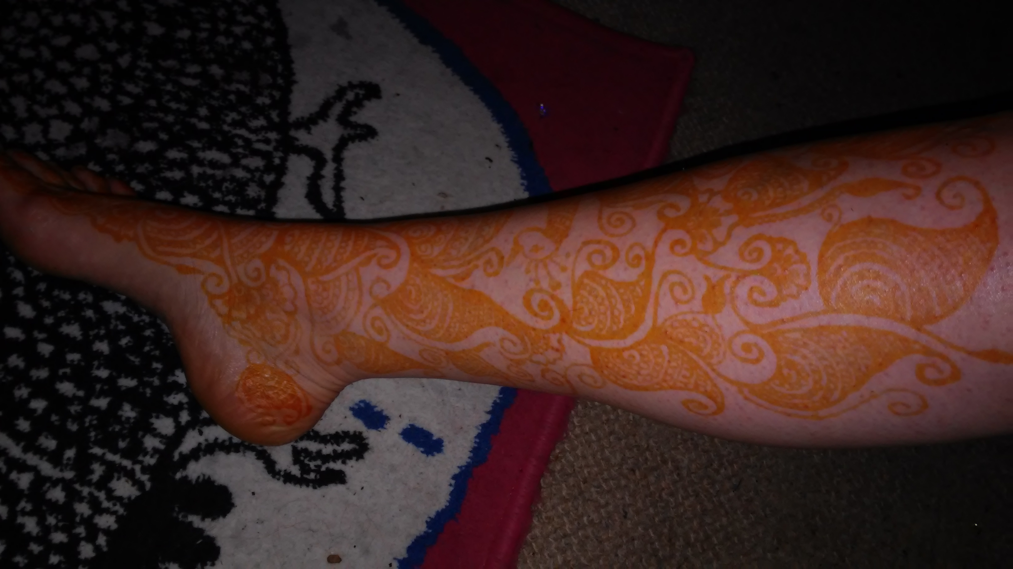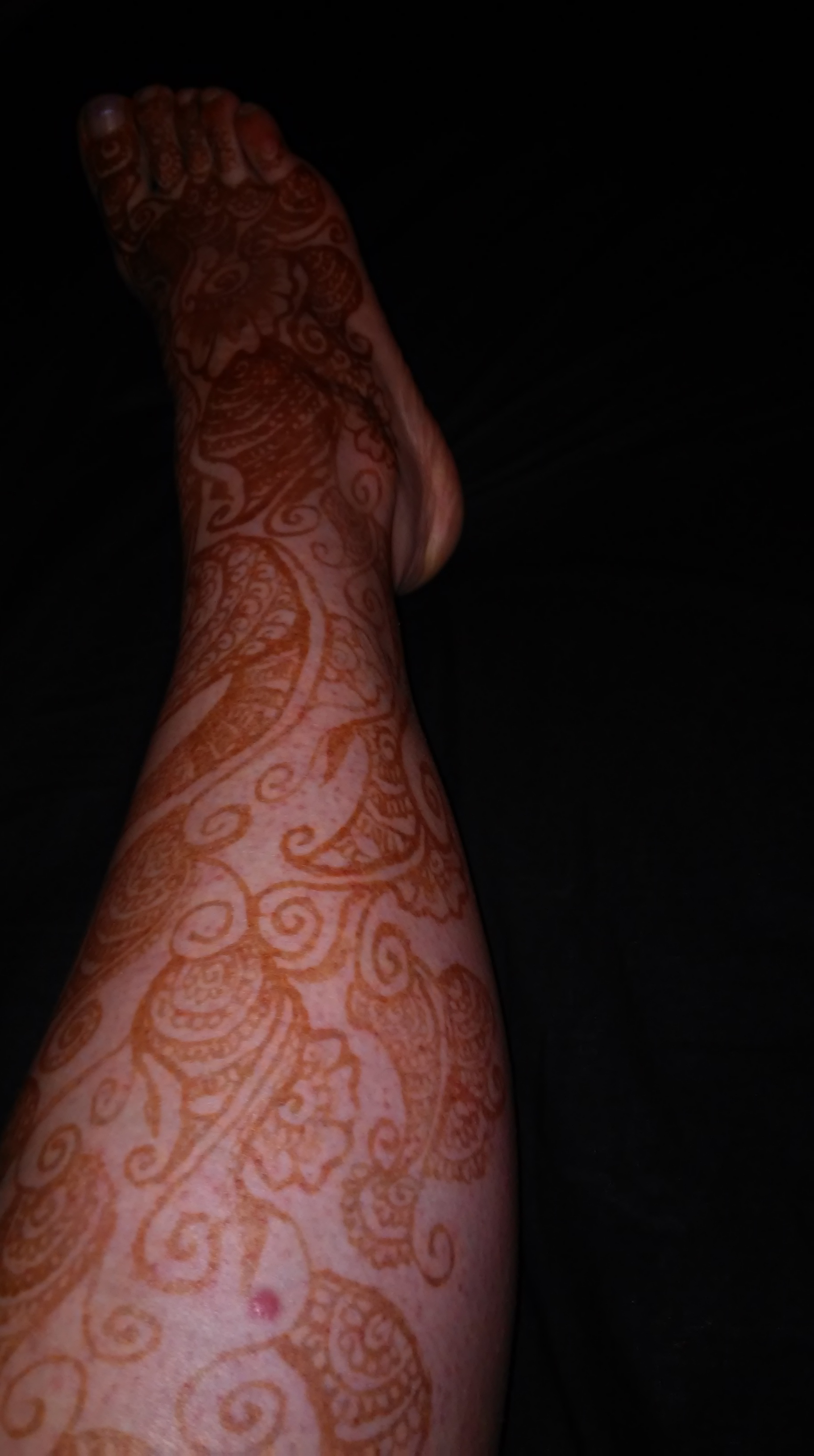 Here are a couple of designs I did a couple of weeks ago on hands.  Also a few weeks back I was experimenting with leaves and birds and decided to decorate my whole leg! Took 3 hours and 2 cones of henna but was great fun!  I’ve also added pictures of the stain developing to show how it darkens.  The stain did darken further on my leg, after about 48 hours it stopped darkening.